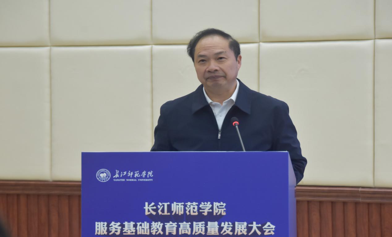 黄大勇现场致辞,向长期关心支持学校发展的市教委、涪陵区政府、各区县教师发展机构和基地学校表示热烈的欢迎和衷心的感谢。他指出,在全国上下深入学习贯彻党的二十届四中全会精神、全市上下深入学习贯彻市委六届八次全会精神的重要阶段,学校召开服务基础教育高质量发展大会,共话基础教育协作,共谋基础教育高质量发展,时机重要,意义重大。学校作为重庆主城区外唯一师范本科院校、渝东新城以及渝东南地区唯一本科院校,自建校以来,始终牢记“为党育人、为国育才”初心使命,坚守“治学促乡”的社会责任,为基础教育培养了大批“下得去、留得住、发展好、水平高”的优秀教师,赢得社会广泛赞誉。他强调,学校将充分发挥地方师范院校在打造高质量教师教育体系中旗舰效应和压舱石作用,与各合作单位一道,共同答好“教育强国、师范何为、基础教育何为”的时代答卷,希望以本次会议为新契机,广泛凝聚合作共识,切实加强沟通协作,推动教育强国、教育强市宏伟蓝图一步步变为现实。