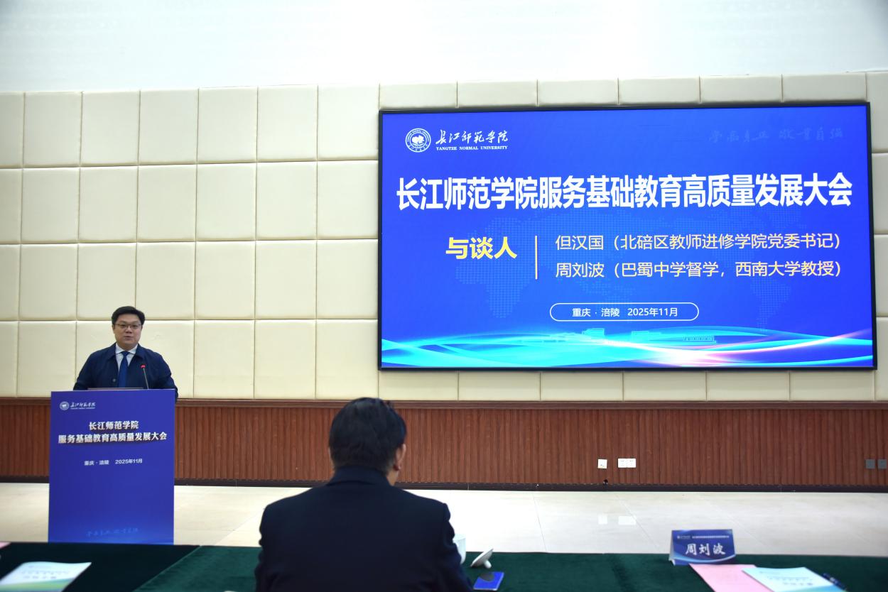 11月27日,学校召开服务基础教育高质量发展大会。会议以“数智时代县域基础教育变革与创新”为主题,旨在深入学习贯彻党的二十届四中全会、市委六届八次全会精神,汇聚师范院校、教师发展机构和中小学校育师强师合力,在教育强国、教育强市建设中彰显长师担当、作出长师贡献。重庆市教委相关处室负责人、涪陵区教委领导、渝东南东北区相关区县教师发展机构负责人、基地校书记校长代表,我校党委书记黄大勇、党委副书记向小川出席会议。党委常委、副校长李柳柏主持开幕式。