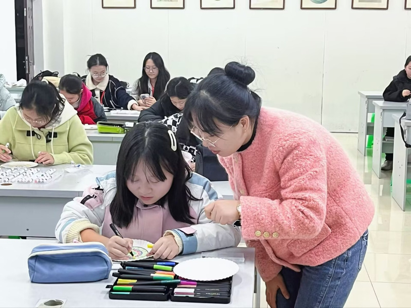 课堂中,孙老师以曼陀罗花为意象,唤起学生们的奇思妙想。同学们观看彩绘曼陀罗视频后早已摩拳擦掌,跃跃欲试,并在最后的实践过程中尽情发挥着自己的想象,将个人色彩融入绘画作品之中。孙老师与学生积极互动,密切注意创作过程,提供个性化的指导,给同学们的画作增添色彩。