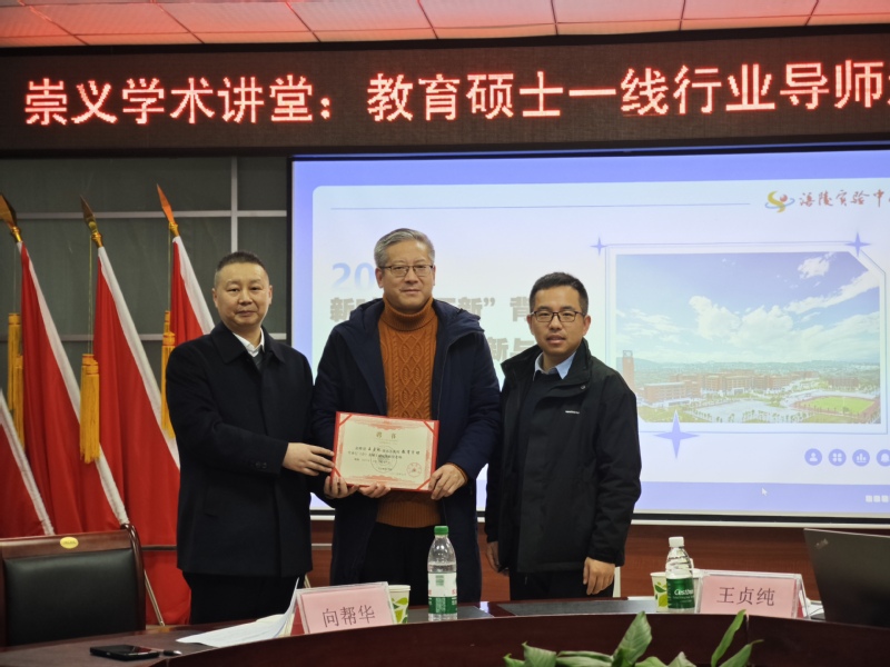 (通讯员 吴佳芋/文,胡露/图)为加强教育管理、学科教学语文等专业研究生校内外多主体实践基地导师资源作用发挥,2025年12月24日上午,长江师范学院崇义学术讲堂之教育硕士一线实践基地行业导师进课堂学术讲座活动在崇仁楼408会议室圆满举办。长江师范学院教育管理专业研究生校外实践基地行业导师、重庆市涪陵实验中学校党委副书记、校长王贞纯基于新时代“三新”背景,就“学校课程教学与学生管理”主题做专题讲座。会前,教师教育学院院长陈恩伦教授与王贞纯校长就相关工作做了交流。重庆市重点人文社科基地暨省级教育智库西南乡村教育创新发展研究中心教育政策法规所所长、教育管理硕士专业负责人暨学科带头人向帮华教授,教育管理学科团队成员、教师教育学院部分教师及全体研究生到场聆听并积极开展学术互动交流。活动由陈允龙博士主持。