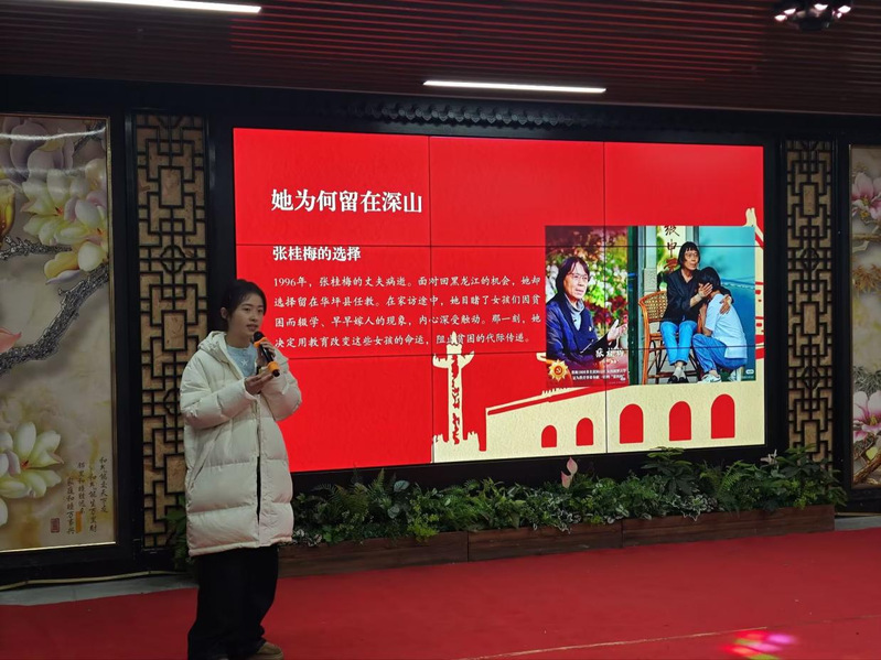 杨紫月同学结合剪纸作品宣讲张桂梅老师的教育坚守,王翔翱宇同学分享“平凡亦能绽放光彩”的感悟,宣讲时的真挚互动被一一定格。《大花轿》《桃花朵朵开》两首歌曲,欢快旋律带动老人们拍手附和。