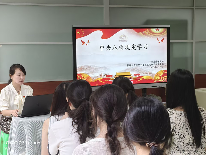 6月19日12时30分,教师教育学院党委红艺先锋学生党支部开展“中央八项规定学习”六月党课活动。活动由学生第一党支部书记郝予琪主持,学生第一党支部全体党员参与。 活动伊始,主讲人围绕中央八项规定的出台背景、核心内容、实施成效及新时代践行要求展开详细讲解,通过理论阐释与案例分析相结合的方式,带领支部党员深入理解其作为我们党改进工作作风、密切联系群众重要举措的深刻意义。 参与学习的党员们认真聆听、积极思考,纷...